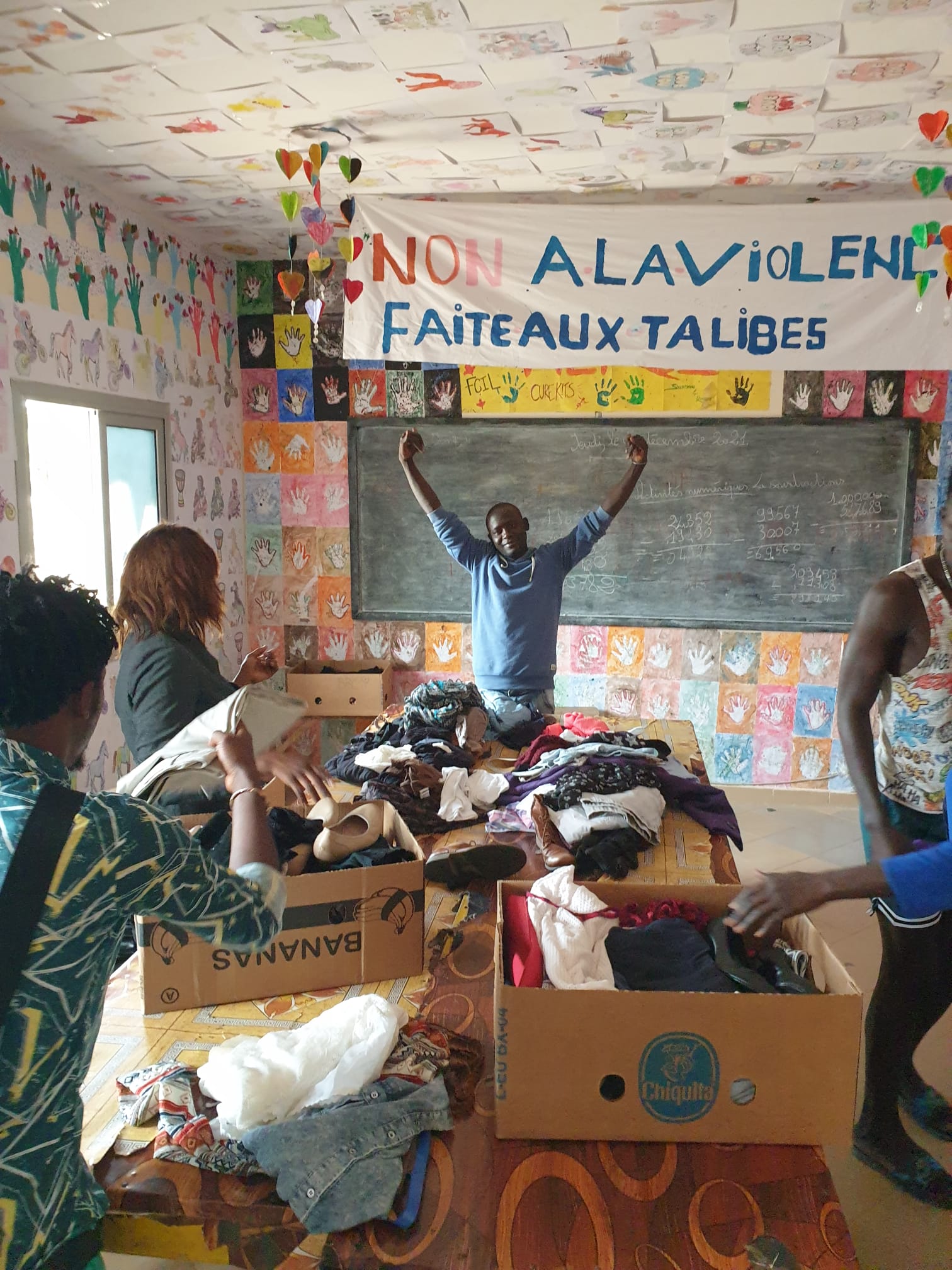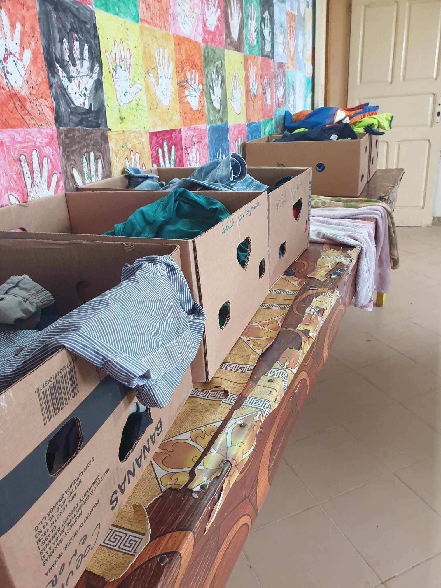 Als erstes ordneten wir die Kleider für Frauen und Babys. Alle vom Team durften für sich selbst eine Kiste mit Kleider für ihre Familie zu Hause füllen. Die Freude war gross. Einige Babykleider haben wir direkt im Quartier verteilt.