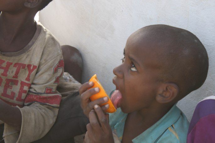 Nach dem Aufräumen der Terrasse geniesst das Team die Ruhe nach dem Sturm und stärkt sich mit Vitaminen (restlichen Orangen).